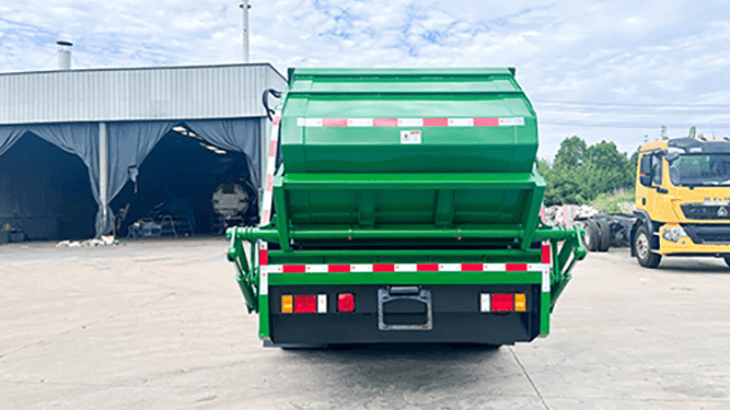 The truck is equipped with a hydraulic compactor mechanism that enables efficient waste loading, compression, and unloading, improving route productivity and reducing manual labor. The hydraulic control system ensures stable and powerful compaction performance.