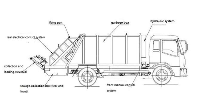 | Others | Composed by hermetic garbage tank, hydraulic system, operation system. The entire truck is hermetic, can automatically compress and dump the garbage .and the sewage generated in the process of the compression all go into the sewage tank | |||