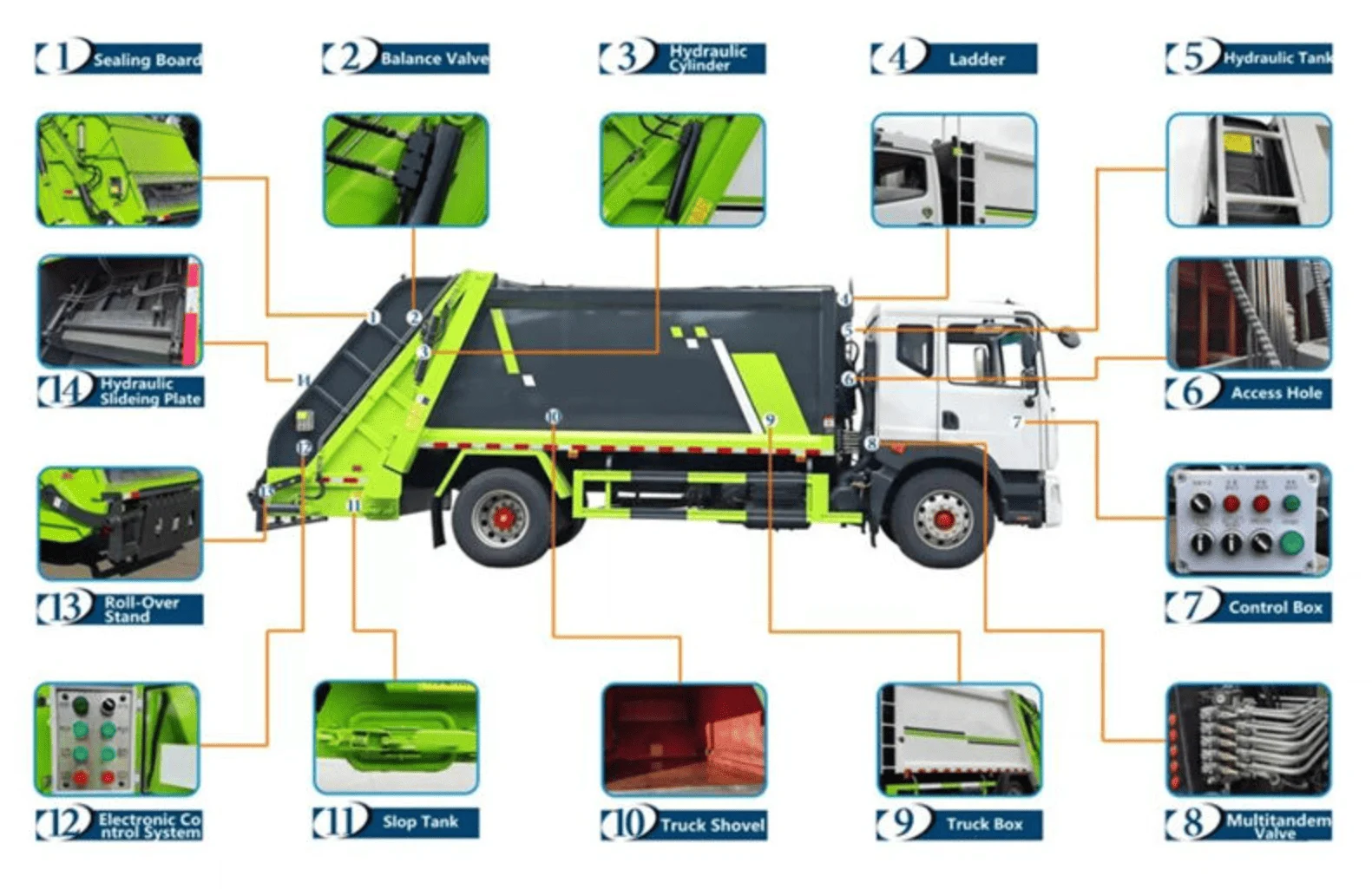 1. Good sealing. To prevent secondary pollution, the garbage compression truck has a fully sealed structure, the garbage is in a closed state during the compression loading and transportation process, the garbage bin and the filler joint surface has a special rubber seal, the sewage tank has a unique discharge valve, which can effectively eliminate the secondary pollution.
